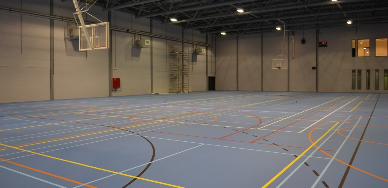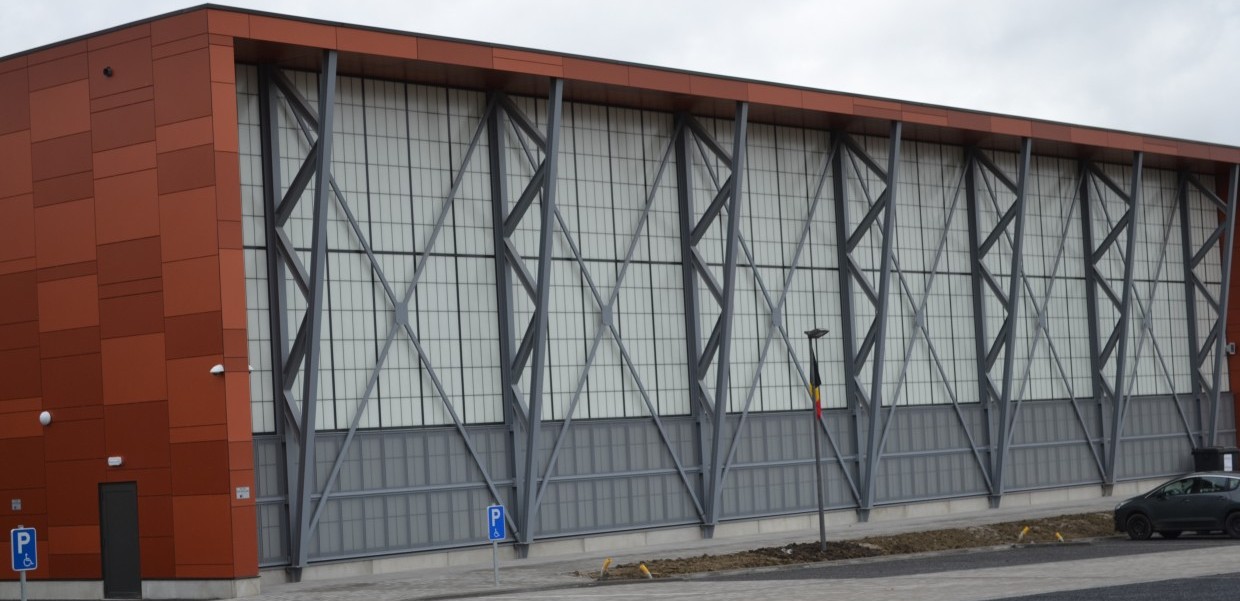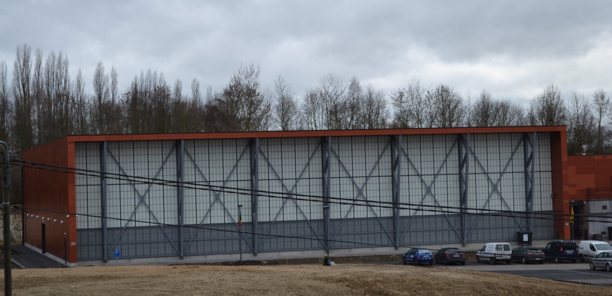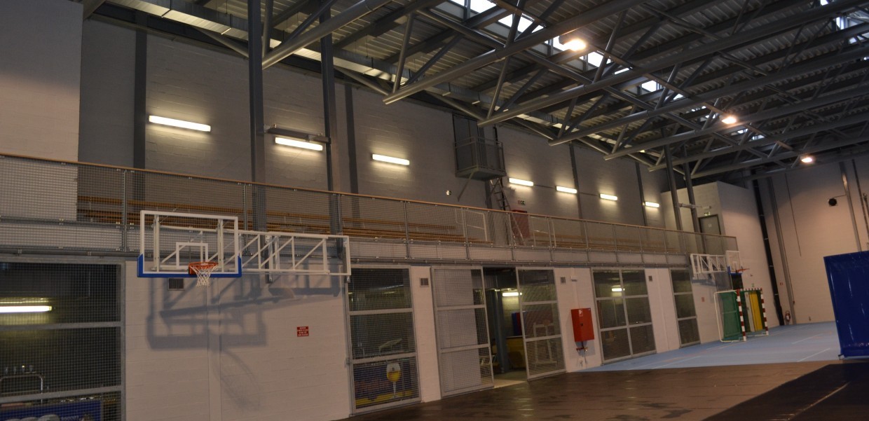 Ce programme sportif est complété par tous les espaces et équipements liés (vestiaires, zones de rangement, espace d’accueil, administration, etc..) et par une cafétéria avec vue vers la salle et vers le terrain de football extérieur.
